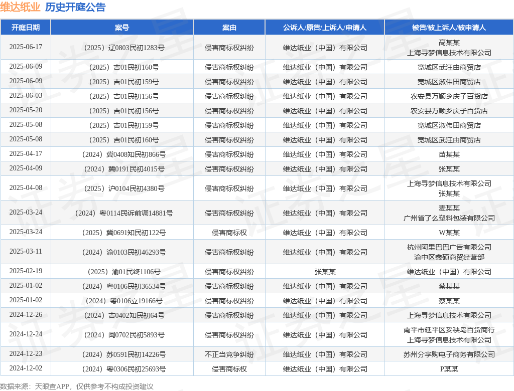 案号:(2025)辽0803民初1283号审理法院:营口市西市区人民法院案由:侵害商标权纠纷当事人信息: 原告/上诉人:维达纸业(中国)有限公司 被告/被上诉人:高某某、上海寻梦信息技术有限公司开庭日期:2025年6月17日根据统计,近一年内以维达纸业(中国)有限公司为当事人的历史开庭公告有37则,其中案由为“侵害商标权纠纷”的公告以31则居首,其次为“侵害商标权”有3则,“不正当竞争纠纷”有1则。历史开庭公告(前20条)如下: